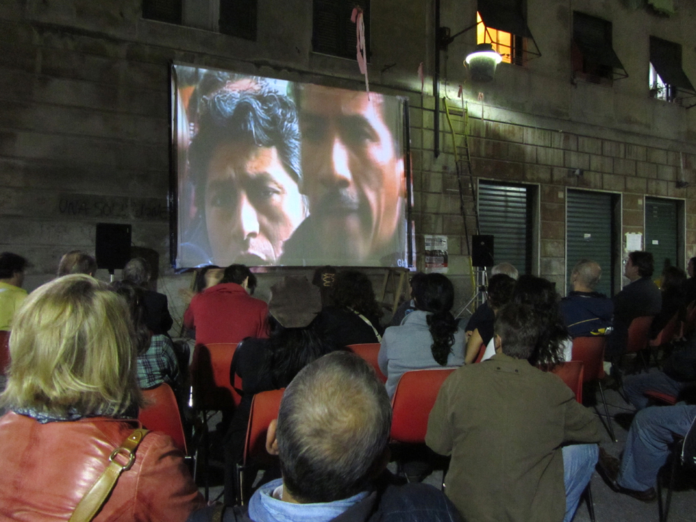 Uno degli organizzatori mi dice che “tutto questo sarebbe stato impensabile senza l’aiuto della gente del quartiere”.Sotto il titolo “Le città e i suoi abitanti si raccontano” inizia la proiezione di brevi filmati realizzati nel corso di due anni da diversi autori che hanno frequentato un corso di formazione per la realizzazione di materiale video. Nel volantino dell’iniziativa si legge: “Uno sguardo fatto di immagini in libertà, insofferenti scomode nervose, irriducibili alle tesi precostituite. Ma anche tenere fragranti poetiche. Immagini che non temono di guardare in faccia la realtà”.