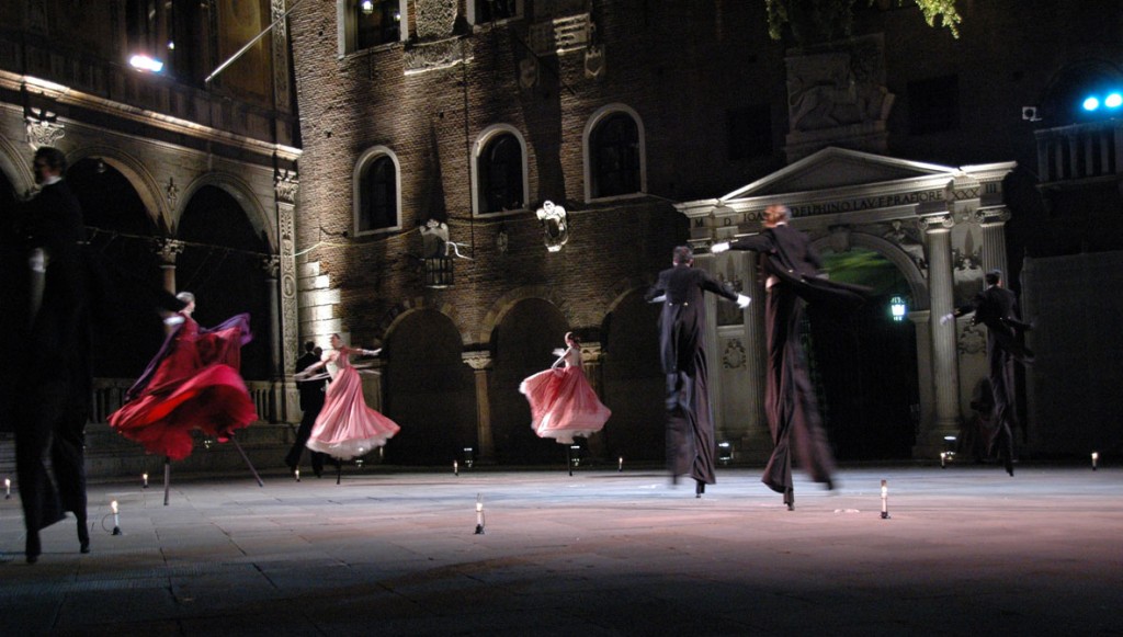 Domenica 20 maggio: nel salone del Maggior Consiglio di Palazzo Ducale a Genova, il Teatro Tascabile di Bergamo (TTB) mette in scena “Valse”, spettacolo di strada in cui quattro donne e quattro uomini su trampoli ballano con la musica di Strauss e Puccini. Il TTB, fondato nel 1972 da Renzo Vescovi, ha un ricco repertorio, articolato tra teatro di sala, spettacoli di strada, progetti per le scuole, al suo attivo vanta numerose tournée in Italia e nel mondo. Queste informazioni, tratte dal sito del TTB, non rendono però assolutamente merito ad uno spettacolo come “Valse”, né tantomeno possono restituire la magica e poetica atmosfera che ha conquistato domenica il pubblico di Palazzo Ducale. Nel salone del Maggior Consiglio lo spazio è in gran parte tenuto vuoto, destinato agli attori-danzatori della compagnia, mentre il folto pubblico, seduto, in piedi, a terra, accalca l’esigua porzione rimasta: inizia la musica, otto “giocolieri” fanno il loro ingresso, poco di meno di quattro metri di altezza ciascuno, figure deformate dalla vita in giù, gli abiti da sera nascondono i trampoli arrivando quasi fino a terra, ad altezza “umana”, dove altri due attori della compagnia, un maestro di cerimonia ed una fanciulla con un enorme palloncino, costituiscono quasi un trait d’union tra noi e loro: lassù va in scena un ballo, si balla, si scherza, ci si ubriaca, si cambia partner, il tutto con movimenti ora flessuosi ora acrobatici che metterebbero in difficoltà molti dei nostri “normali” arti inferiori, dotati di banali calzature, magari firmate.